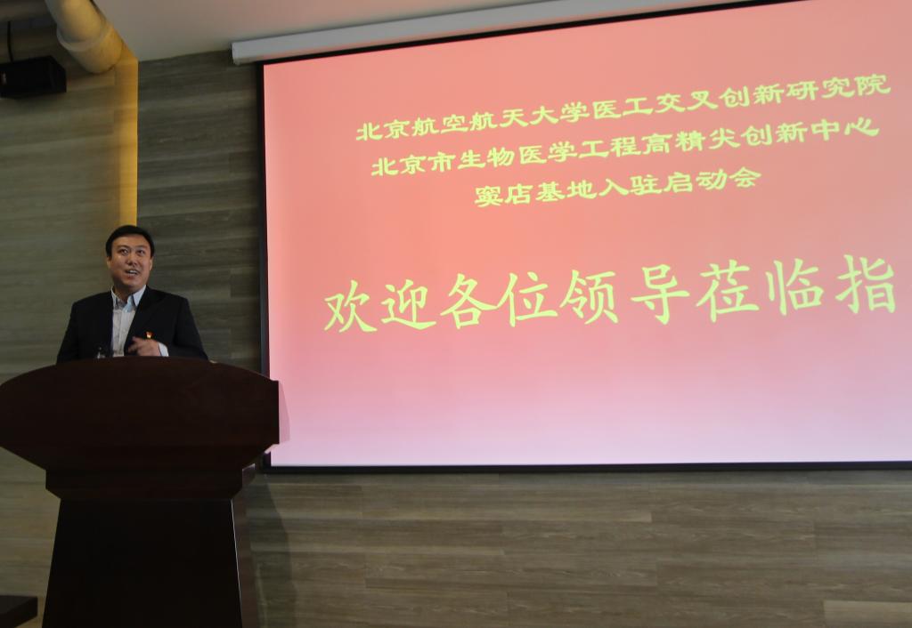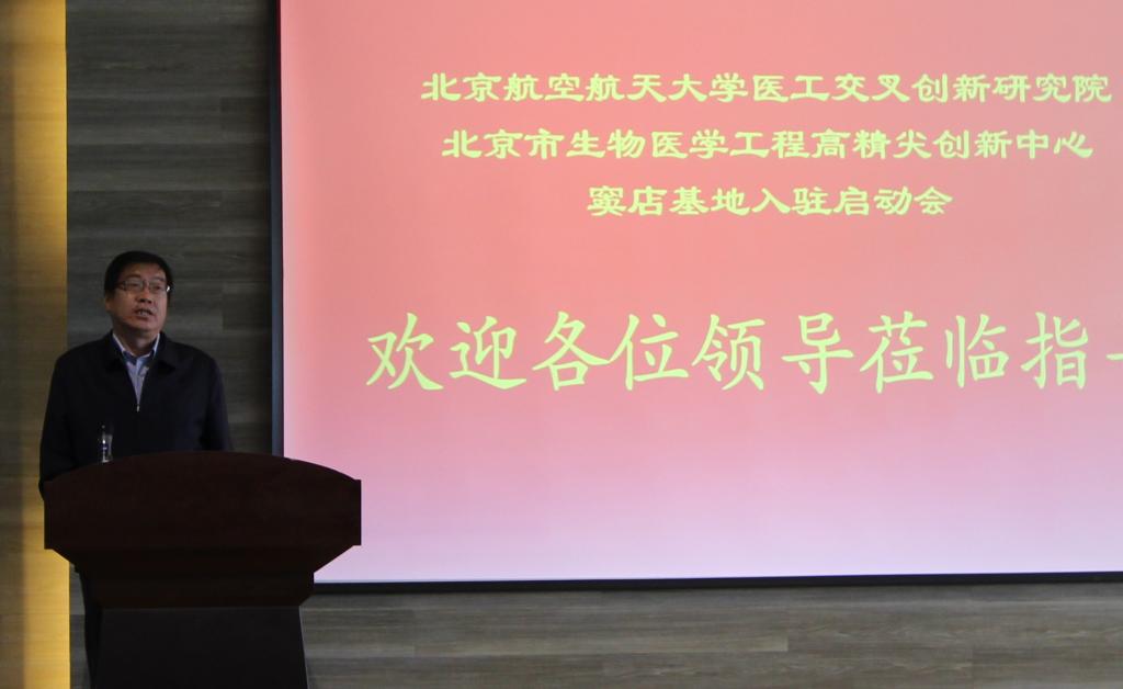 北京高端制造业基地管委会副主任蔡禄鹏在致辞中代表北京高端制造业基地对北航领导、老师以及学生的入驻表示祝贺以及热烈欢迎,作为北京市高校创新资源产业的承载,此次入驻是房山和北航合作的新起点,基地管委会对窦店园区的相关配套设施建设正在逐步完善,基地会全力为医工交叉研究院与高精尖中心服务,最后蔡主任预祝北航在窦店的土壤上落地生根,结出丰硕的果实。