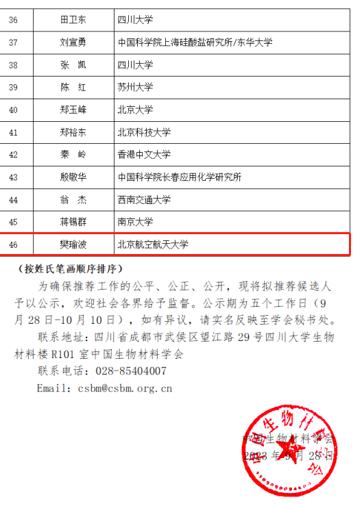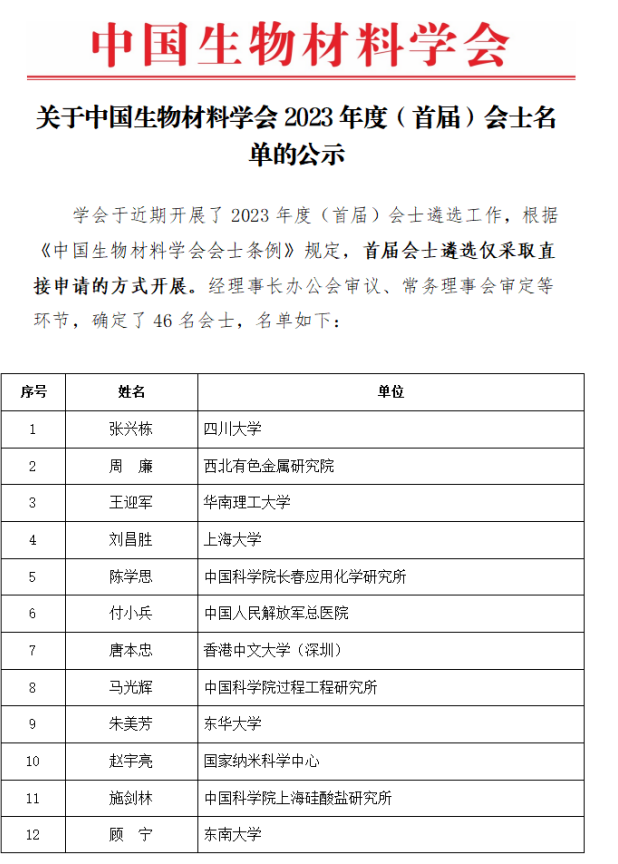 谨向当选的中国生物材料学会首届会士们致以热烈的祝贺!